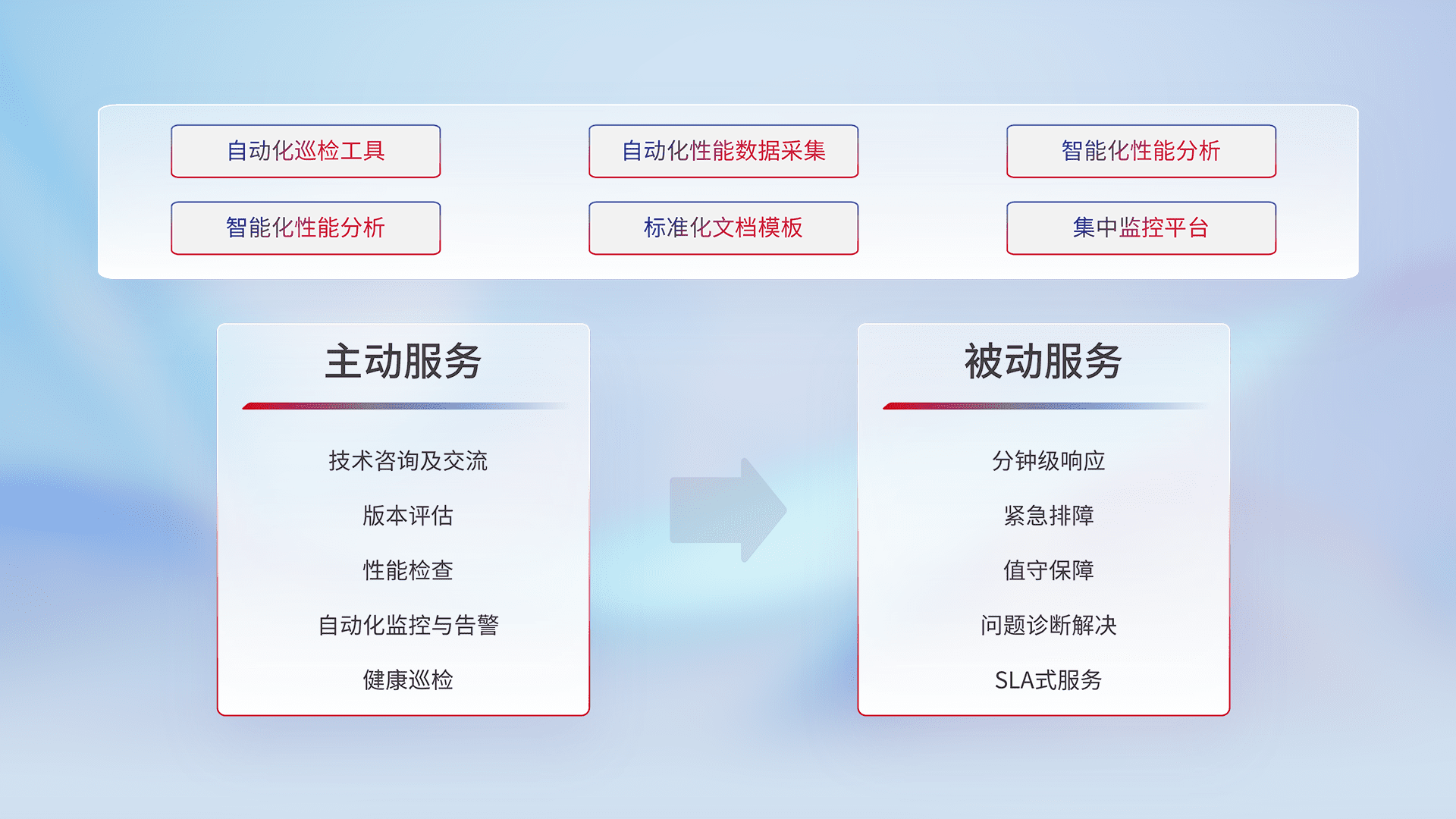 智能化工具和标准化文档,,保障服务质量,,,,提供主动服务(包含技术咨询、、版本评估、、、、性能检查、、自动化监控与告警、、健康巡检)和被动服务包含(分钟级响应、、、紧急排障、、、值守保障、、、问题诊断解决、、、SLA服务)。。。。